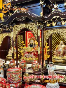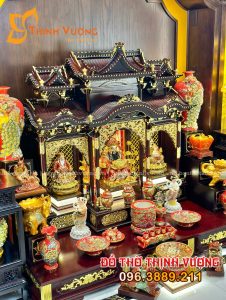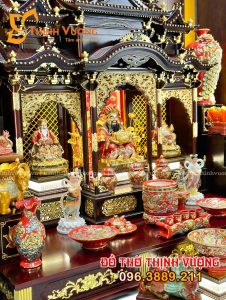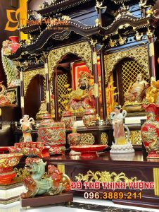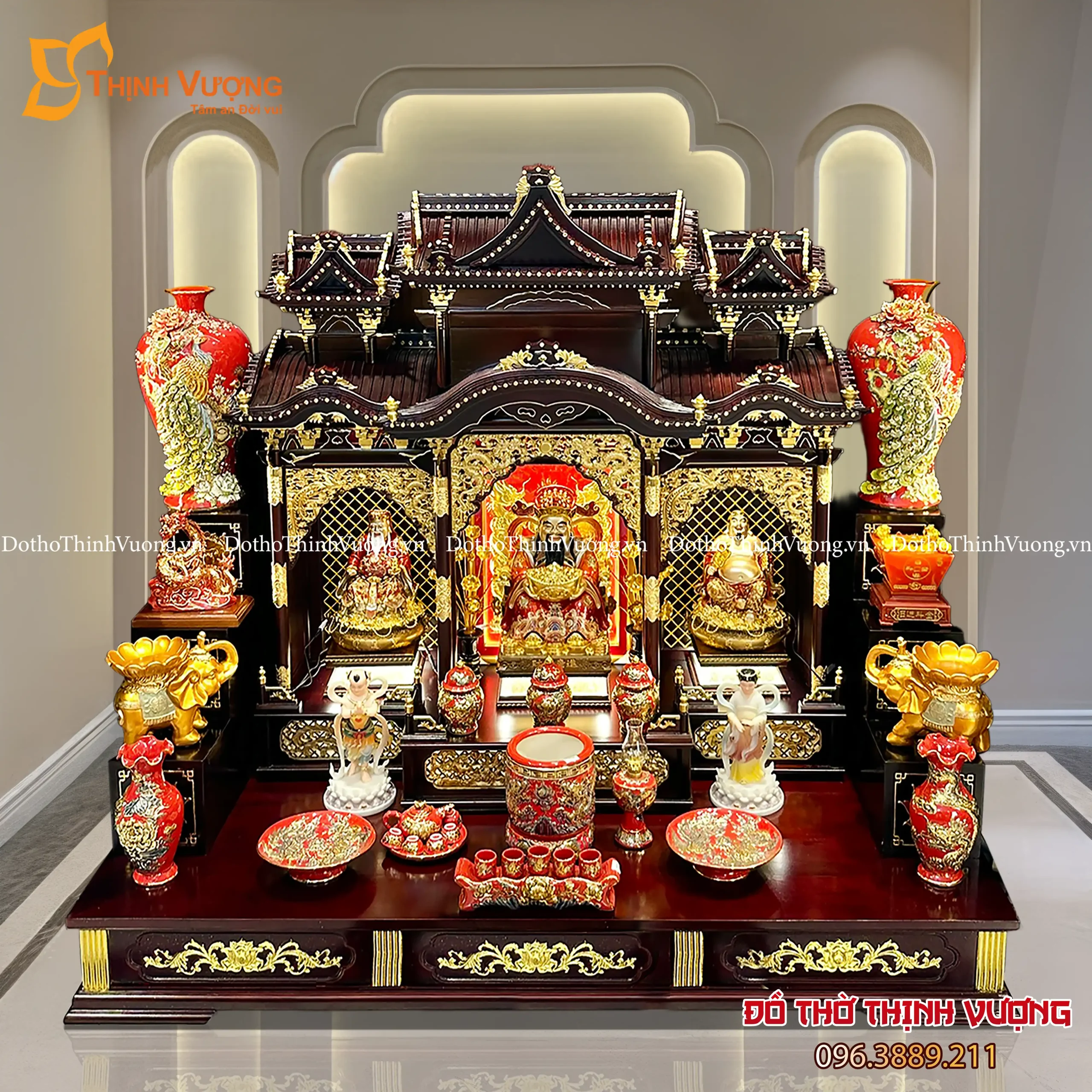 Trọn Bộ Ban Thần Tài 3 Gian Gỗ Hương Nâu Đỏ + Sứ Đỏ Nổi Vẽ Vàng