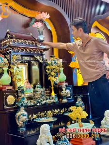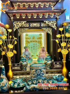Bộ Ban Thờ Thần Tài Gỗ Long Não + Sứ Xanh Lục Bảo Vẽ Vàng
