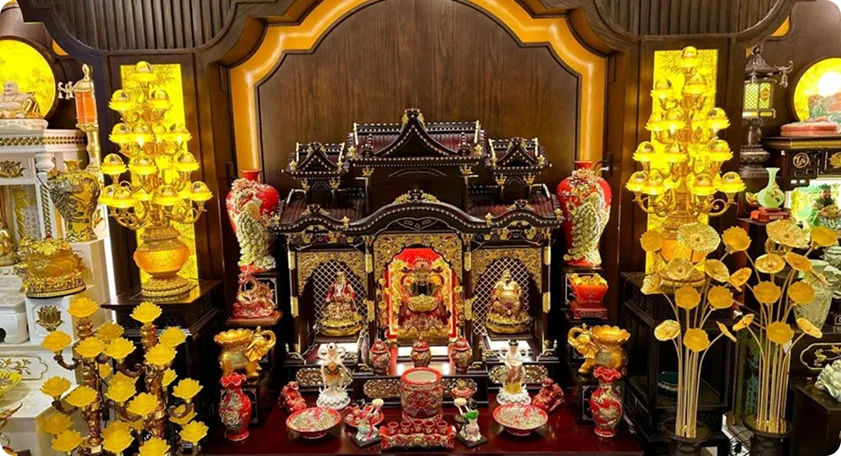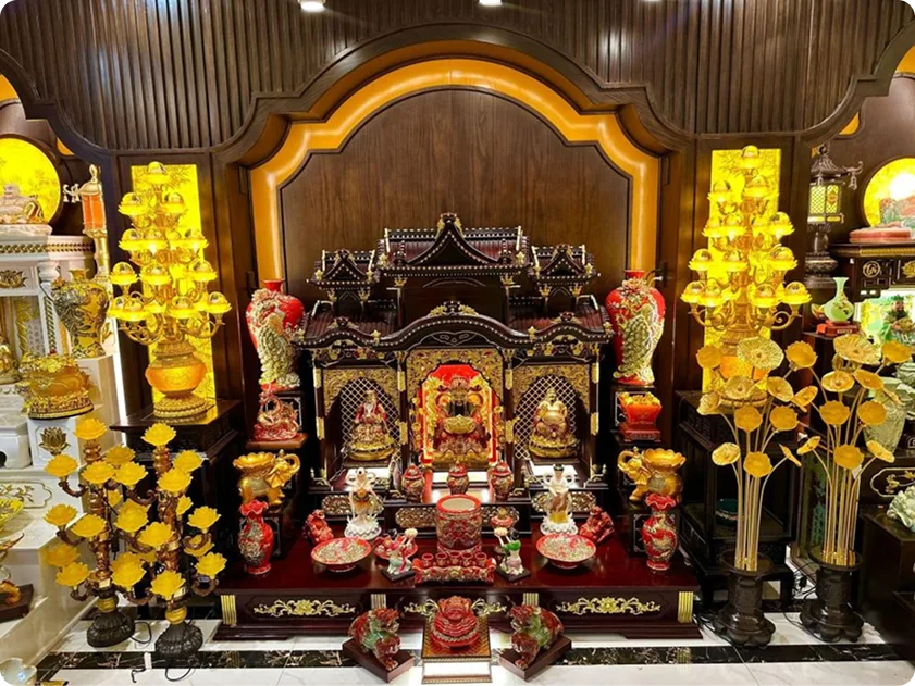 Từ việc chọn lựa bàn thờ, tượng Phật, Thần Tài, đến các vật phẩm thờ cúng như bát hương, đỉnh đồng, lọ hoa, tất cả đều được thực hiện một cách chuyên nghiệp, chu đáo.